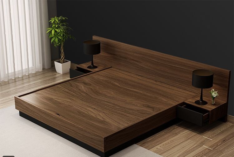 Mẫu giường này được thiết kế dát giường nâng rất tiện lợi mỗi khi khách hàng muốn lấy đồ. Ngoài ra giường còn được sử dụng 2 hộc đầu giường được gắn trực tiếp vào giường rất tiện dụng. 2 tap đầu giường là 2 ngăn kéo khác màu được sử dụng để chứa đựng các vật dụng cá nhận và 2 cánh cửa ngăn kéo được đóng mở hoàn toàn tự động mà không cần sử dụng đến nắm.